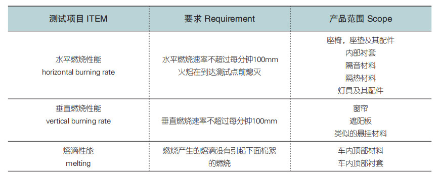 2.目前國家對(duì)汽車內(nèi)飾材料的標(biāo)準(zhǔn)只有GB8410-2006,該標(biāo)準(zhǔn)對(duì)部分內(nèi)飾材料缺乏對(duì)真實(shí)試驗(yàn)的模擬。而除了汽車,客車、校車等大型車輛對(duì)內(nèi)飾材料燃燒的條款也是引用自GB8410-2006。長途客車大量配備窗簾懸掛物,按汽車燃燒標(biāo)準(zhǔn)來對(duì)其評(píng)價(jià)是缺乏參考意義的。目前客車內(nèi)飾材料的燃燒特性標(biāo)準(zhǔn)正在起草討論中。希望此標(biāo)準(zhǔn)實(shí)施能完善目前標(biāo)準(zhǔn)的弊端。如果需要對(duì)材料進(jìn)行全真實(shí)的評(píng)價(jià)體系,除去阻燃性,還有霧化性能、車內(nèi)VOC測(cè)試,材料常規(guī)性能測(cè)試全面進(jìn)行評(píng)價(jià)。